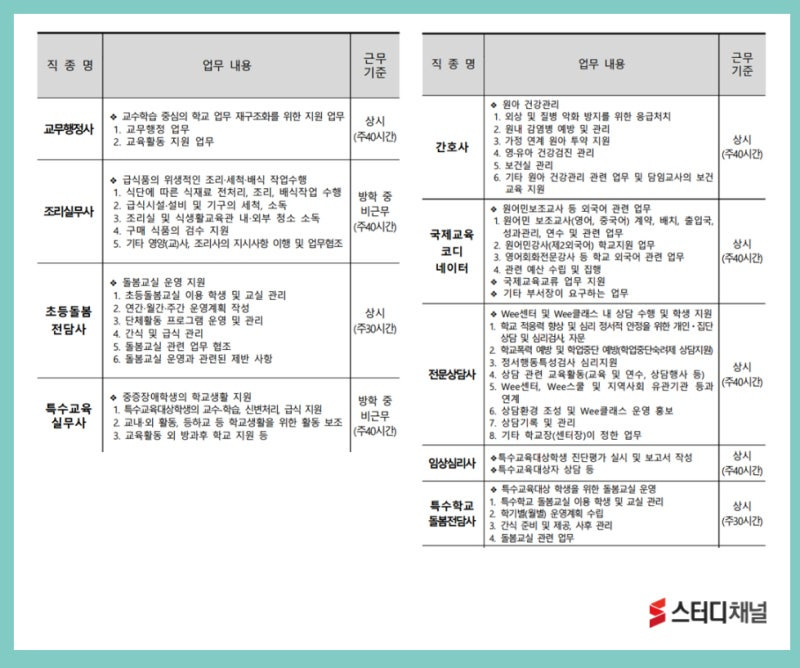 이 표는 교육공무직의 다양한 직무와 그에 따른 책임 및 근무 기준을 보여줍니다. 또한, 보건 분야에서는 간호사와 같은 직무가 있으며, 환경 관리와 관련된 직무도 존재합니다.