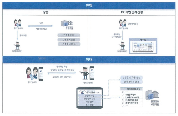 현재의 부동산 등기 시스템은 주로 대면 방식으로 진행되며, 많은 서류 작업과 시간이 소요됩니다. 반면, 미래등기시스템은 모바일 기기와 온라인 플랫폼을 통해 자동화된 데이터 생성과 정보 접근을 가능하게 합니다.