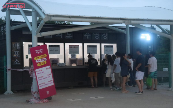 오후 7시를 훌쩍 넘은 시간. 여의도 한강공원 수영장의 문은 활짝 열려 있었고, 매표소에는 대기줄이 있을 정도로 인기가 많았다. 앞줄에는 외국인 관광객도 있었는데, 시민뿐만 아니라 외국인 관광객도 즐겨 찾는 명소였다. 요금 5,000원을 내니 야간 개장은 ‘달빛티켓’이라고 해서 입장권과 음료, 수영장 내 카페 할인 쿠폰을 주었다.