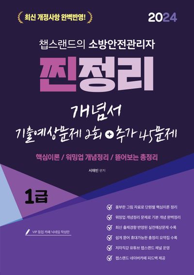 - 챔스랜드의 소방안전관리자 찐정리 (2024): 이 책은 개념서, 기출 예상 문제, 총정리 등을 포함하여 체계적으로 정리되어 있습니다.