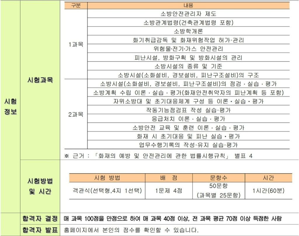 - 2급 시험 : 화재 예방 및 안전 관리, 소방 시설의 운영 및 관리 등