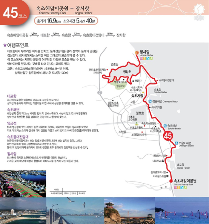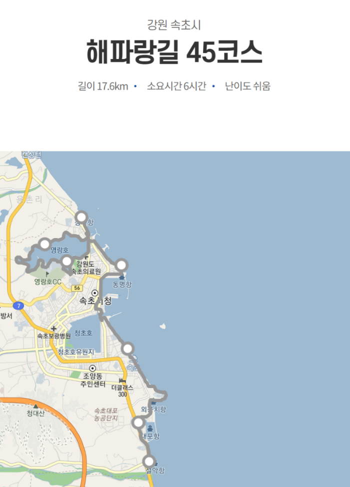 코스 주변에는 풍부한 관광지가 많이 있습니다. 예를 들어, 대포항에서는 신선한 해산물을 맛볼 수 있고, 속초 해변은 여름철 피서를 즐기기에 좋은 장소입니다. 또한, 근처에는 설악산 국립공원도 있어 보다 다양한 자연경관을 즐길 수 있습니다.