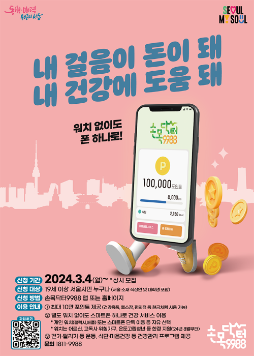 ○ 모집대상 : 19세 이상 서울시민(서울 소재 직장인 및 대학생 포함) ○ 신청방법 : 손목닥터9988 누리집 또는 스마트폰 앱 ( 안드로이드 / iOS ) 통해 신청(회원가입) ○ 제공혜택 : 걷기, 건강카드, 식단관리 등 미션달성 시 최대 10만 포인트 제공(서울페이로 전환·사용) ○ 문의 : 1811-9988 |