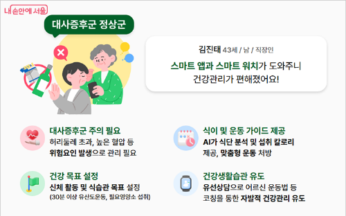 대사증후군은 기존 보건소 방문을 통해 관리되었으나 손목닥터 앱을 통해 대사증후군 검사 결과를 스스로 모니터링하고 걸음, 식단 정보 등 건강데이터를 AI가 분석‧평가하여 개인별 맞춤형 건강관리 프로그램을 제공한다.