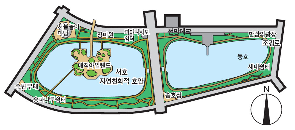 주변에는 다양한 명소와 편의시설이 있어 방문객들에게 편리함을 제공합니다. 롯데월드와 매직아일랜드가 가까이 있어 가족 단위 방문객들에게도 좋은 선택이 될 수 있습니다. 또한, 공원 내에는 피아니시모 쉼터와 새내쉼터 같은 휴식 공간이 마련되어 있어, 산책 중 잠시 쉬어갈 수 있는 장소도 많습니다.