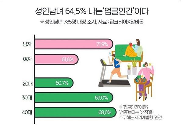 여기서 묘사된 그래프는 성인들 중 64.5%가 자신을 '어른'이라고 인식하는 결과를 보여줍니다. 이러한 인식은 자기계발과 관련된 여러 활동을 통해 이루어진 것입니다.