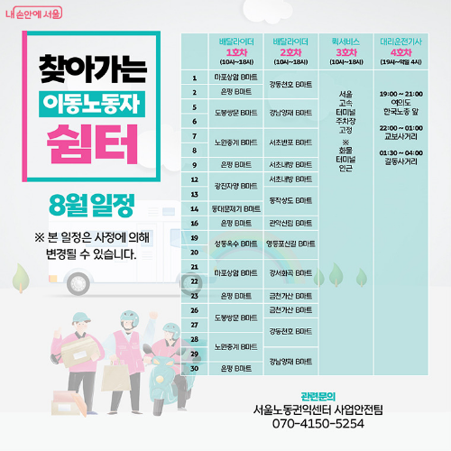 서울노동권익센터는 여름철 무더위 속에서 일하는 배달라이더, 퀵서비스 기사, 대리운전 기사 등을 위해 ‘찾아가는 이동노동자 쉼터’를 10월 4일까지 운영한다. ‘찾아가는 이동노동자 쉼터’ 관련 이용 및 상담은 서울노동권익센터 전화(02-6925-4349 / 070-4150-5254) 또는 누리집으로 문의하면 된다.