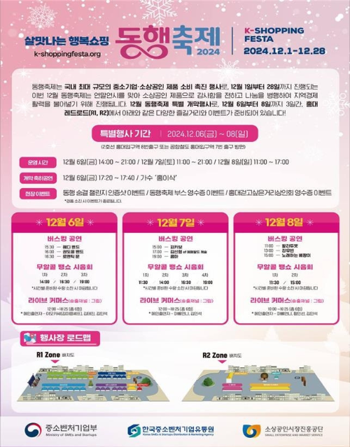 동행축제에서는 다양한 공연과 제품 시연이 진행돼요. 예를 들어, 버스킹 공연, 먹거리 장터, 그리고 중소기업 제품 체험 부스 등이 마련될 예정이에요. 특히, 12월 6일부터 8일까지는 R1 구역에서 라이콘과 동행 제품 판매관이 운영되며, 청년 상인관도 열려요.