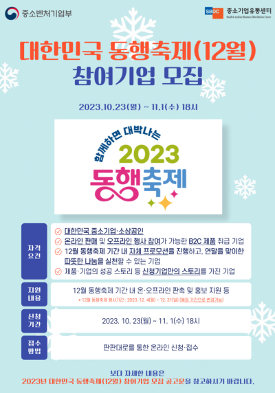 참여를 원하는 기업은 2023년 10월 23일부터 11월 1일까지 신청할 수 있어요. 중소기업 및 소상공인이라면 누구나 신청 가능하며, 온라인 판매와 B2C 제품 참여가 가능해요. 축제 기간 동안 다양한 홍보 활동도 지원받을 수 있어요.