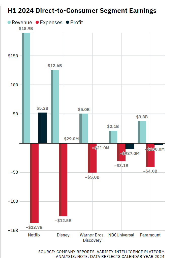 2024년 상반기 동안의 스트리밍 서비스 수익을 살펴보면, 넷플릭스와 디즈니가 큰 손실을 보고 있는 상황입니다. 넷플릭스는 -137억 달러의 손실을 기록하였고, 디즈니는 -125억 달러의 손실을 보였습니다. 이러한 수치는 스트리밍 서비스들이 직면한 재정적 도전 과제를 잘 보여줍니다.
