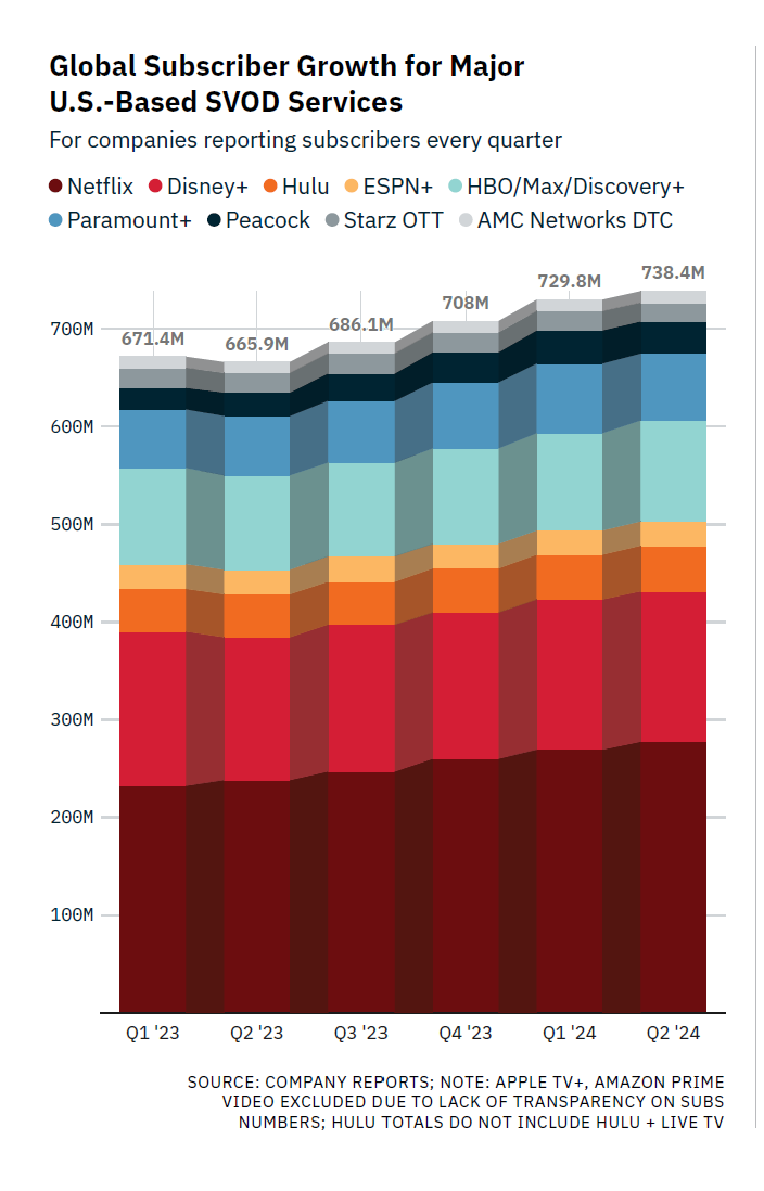 하지만, 전체적으로는 스트리밍 서비스의 구독자 수가 증가하고 있으며, 이는 긍정적인 신호로 해석될 수 있습니다. 특히, 2023년 1분기부터 2024년 2분기까지의 글로벌 구독자 성장 추세를 보면, 넷플릭스가 여전히 선두를 유지하고 있습니다.