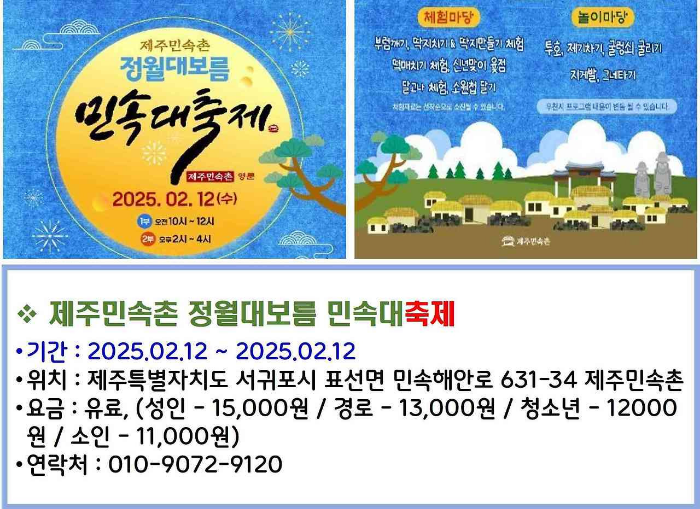 제주도에서는 정월 대보름을 기념하여 민속촌에서 특별한 축제를 개최합니다. 이 축제는 전통적인 문화 체험과 함께 다양한 공연이 펼쳐지며, 제주도의 독특한 문화를 경험할 수 있는 기회를 제공합니다. 2025년 2월 12일에 열릴 예정입니다.