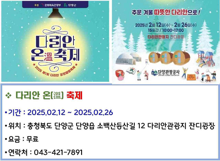 충청북도 단양에서 열리는 다리안 온 축제는 2025년 2월 12일부터 26일까지 진행됩니다. 이 축제는 겨울철 다양한 액티비티와 함께 무료로 참여할 수 있는 행사입니다. 다리안 관광 플라자에서 열리며, 겨울의 아름다움을 만끽할 수 있는 기회가 될 것입니다.