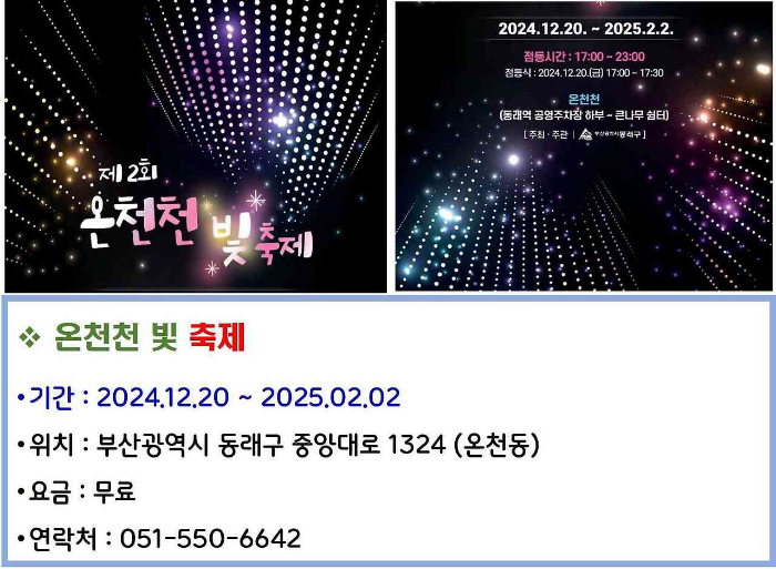 부산 동래구에서 열리는 온천천 빛 축제는 2024년 12월 20일부터 2025년 2월 2일까지 진행됩니다. 이 축제는 화려한 조명과 함께 겨울의 낭만을 느낄 수 있는 행사로, 매일 저녁 5시부터 11시까지 운영됩니다. 무료로 입장할 수 있으며, 가족과 함께 즐기기 좋은 축제입니다.